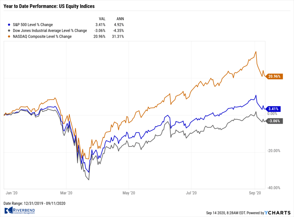 U.S. stocks pulled back further from recent highs in a shortened but highly volatile trading week. The technology-heavy NASDAQ Composite index fared the worst, declining -4.1% and ending the week in correction territory—down 10% or more from the all-time high it reached on September 2nd. The Dow Jones Industrial Average shed 467 points finishing the week at 27,665, a decline of -1.7%.